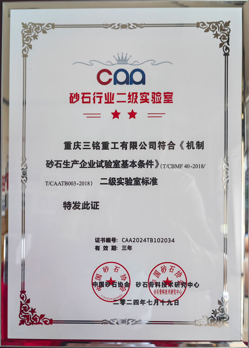 2024年7 月31 日,第十一屆全國砂石骨料行業(yè)科技大會在浙江湖州圓滿落幕。在本次大會上,重慶三銘重工成功榮獲機(jī)制砂石生產(chǎn)企業(yè)二級實(shí)驗(yàn)室的殊榮。