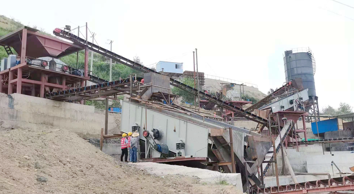 The DYS double-shaft vibrating screen is used for graded screening, and the water washing process, stone powder silo, and finished aggregate storage silo are designed.