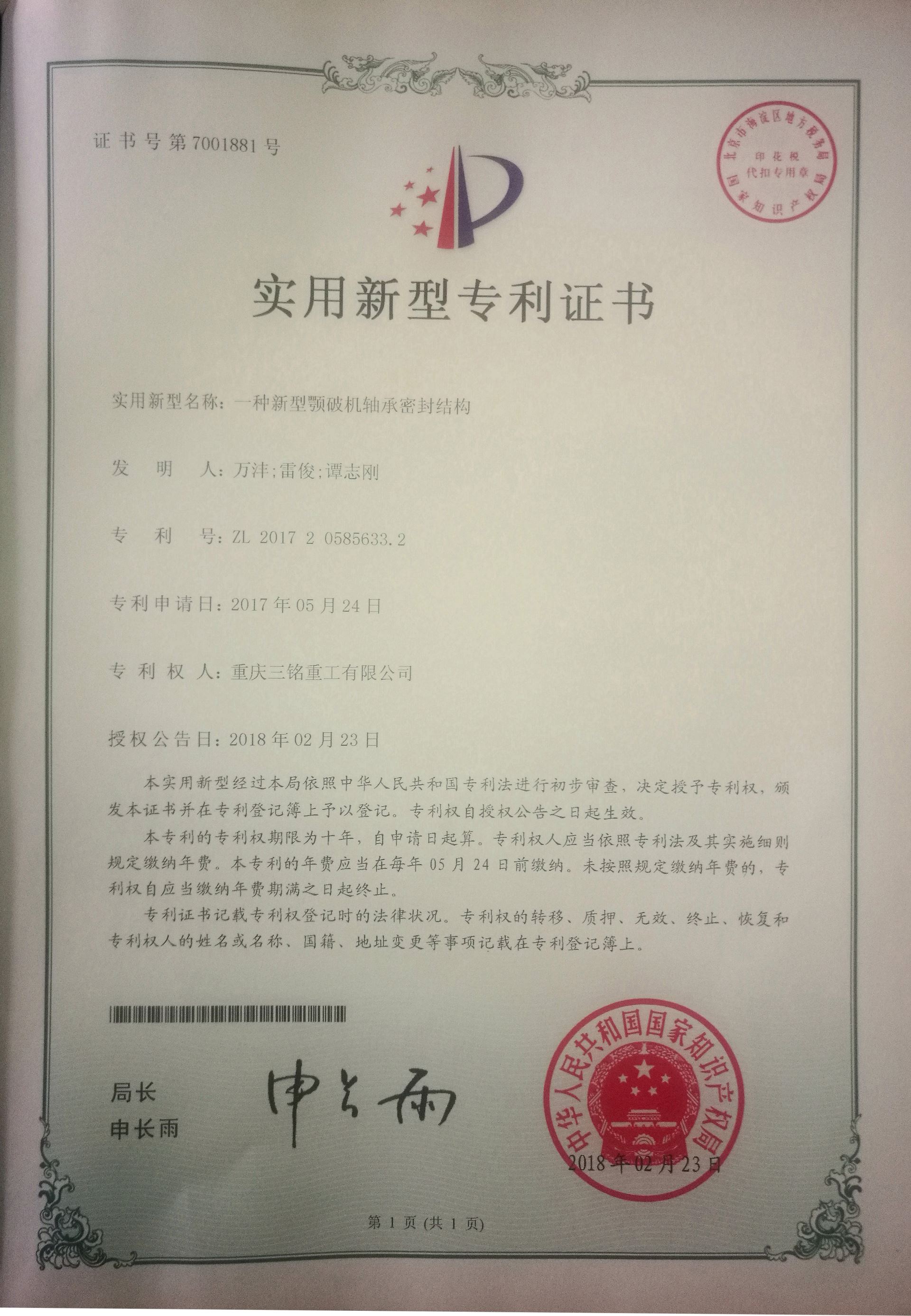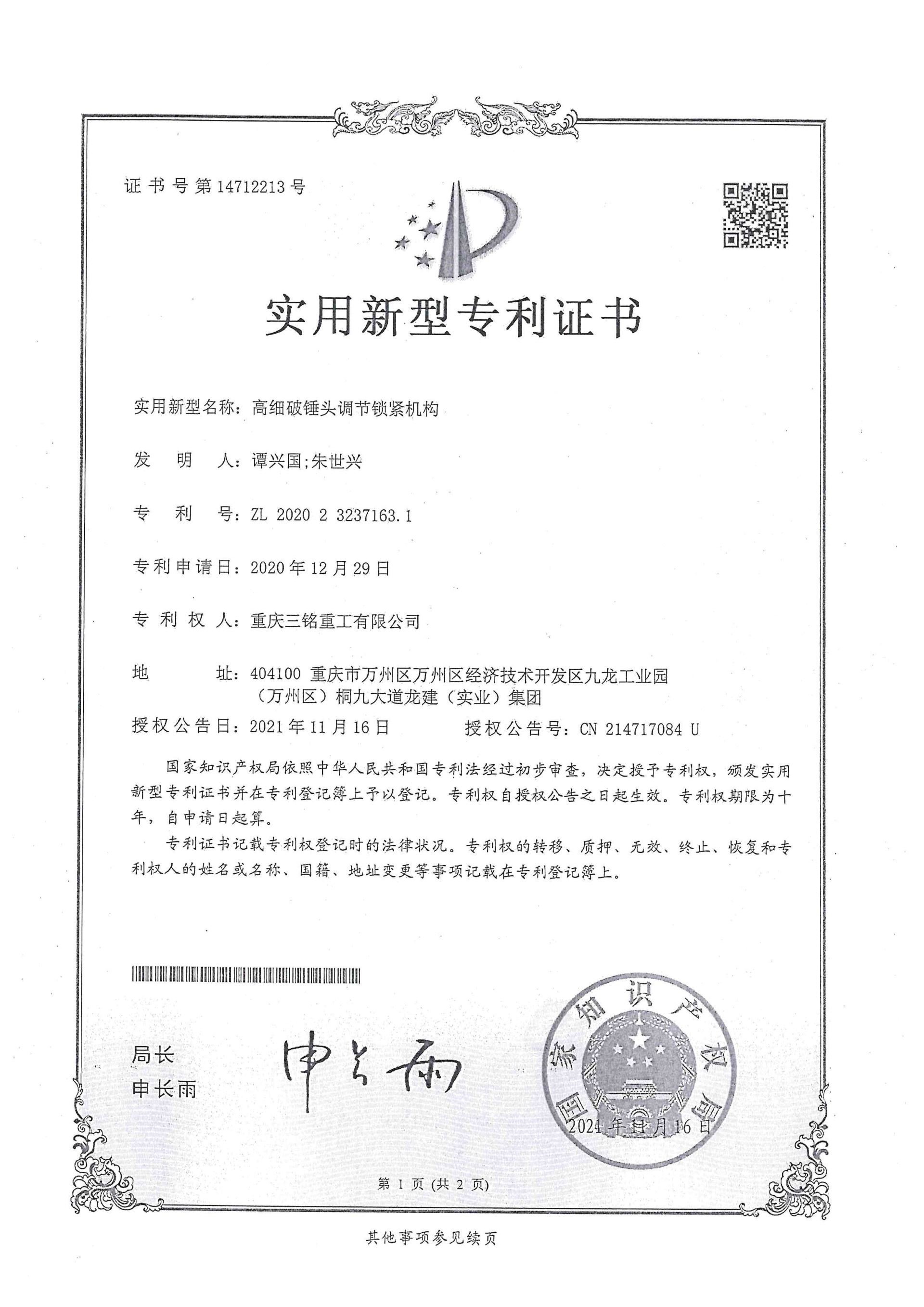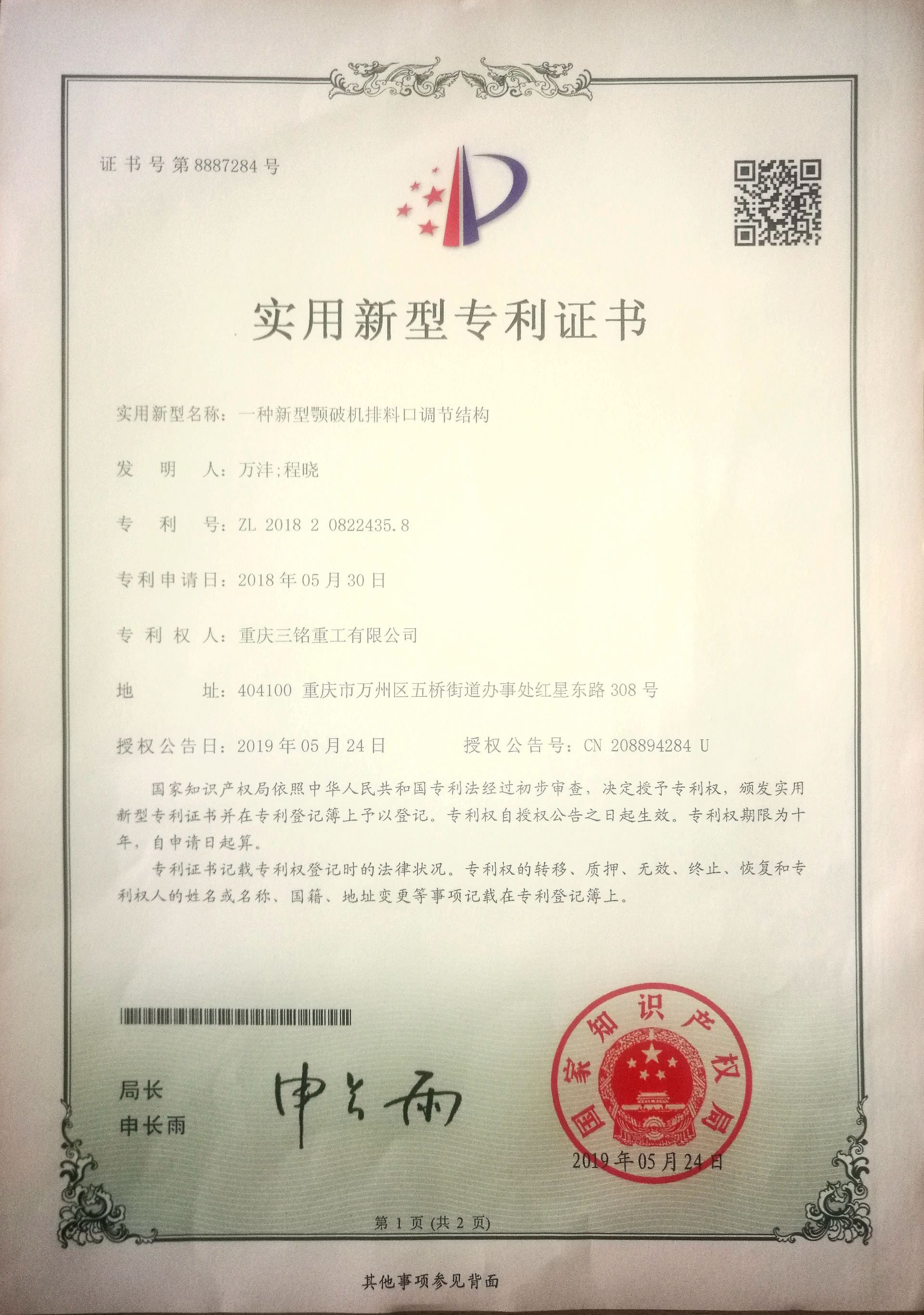 實(shí)用新型專利證書(新型顎破機(jī)彈簧拉桿調(diào)節(jié)機(jī)構(gòu))