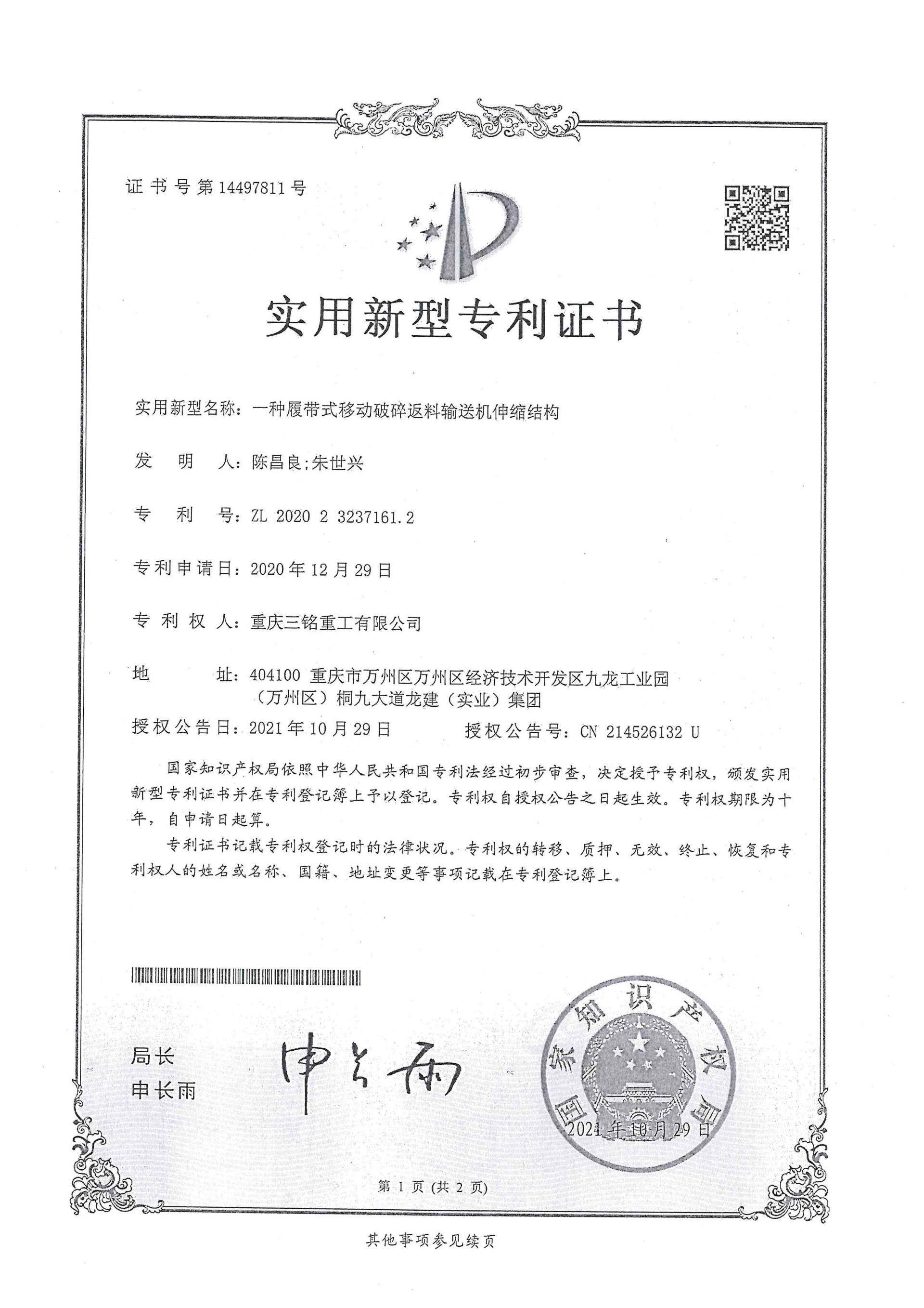 實(shí)用新型專利證書(履帶式移動(dòng)破碎返料輸送機(jī))