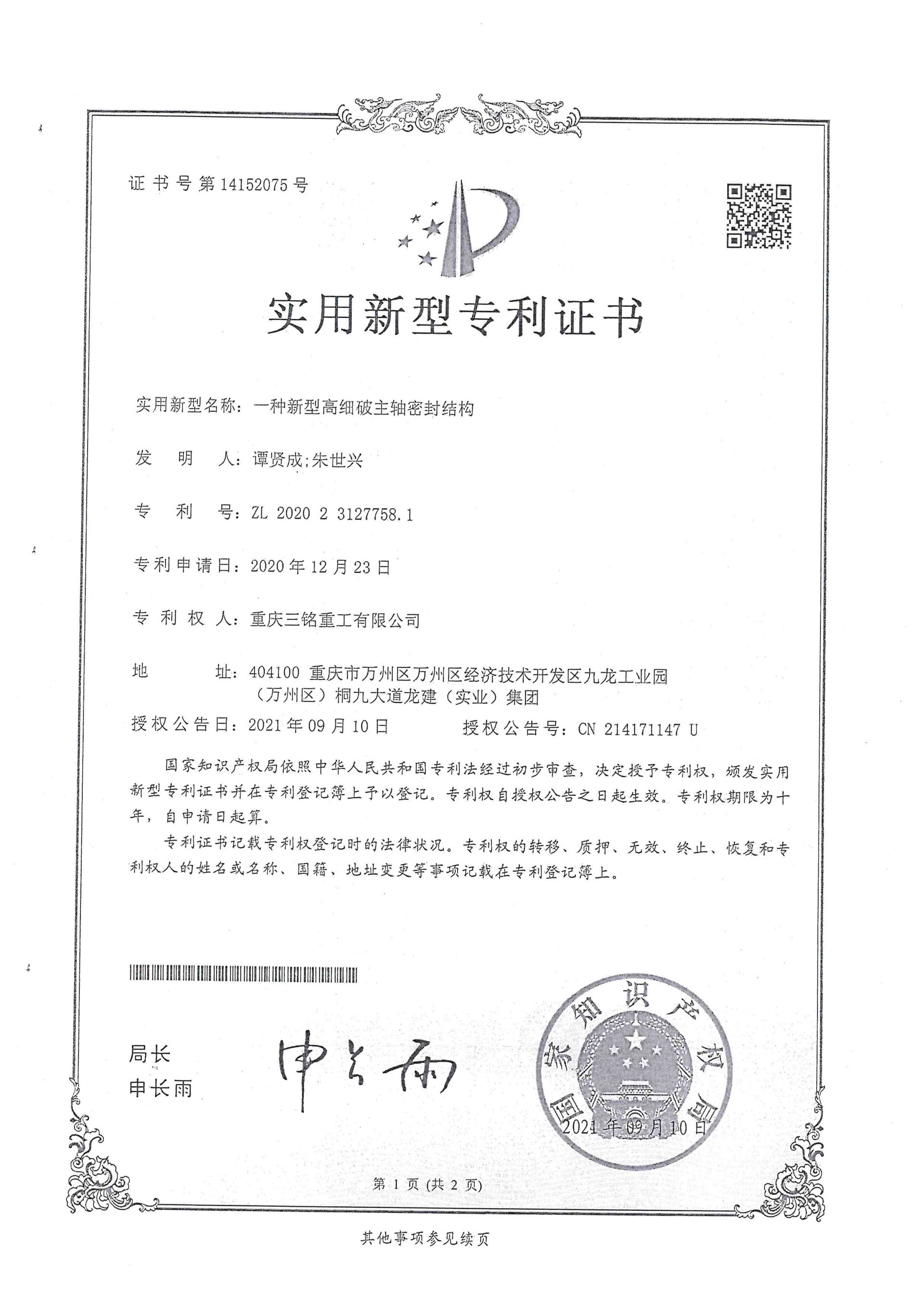 實(shí)用新型專利證書(高細(xì)破主軸密封結(jié)構(gòu))