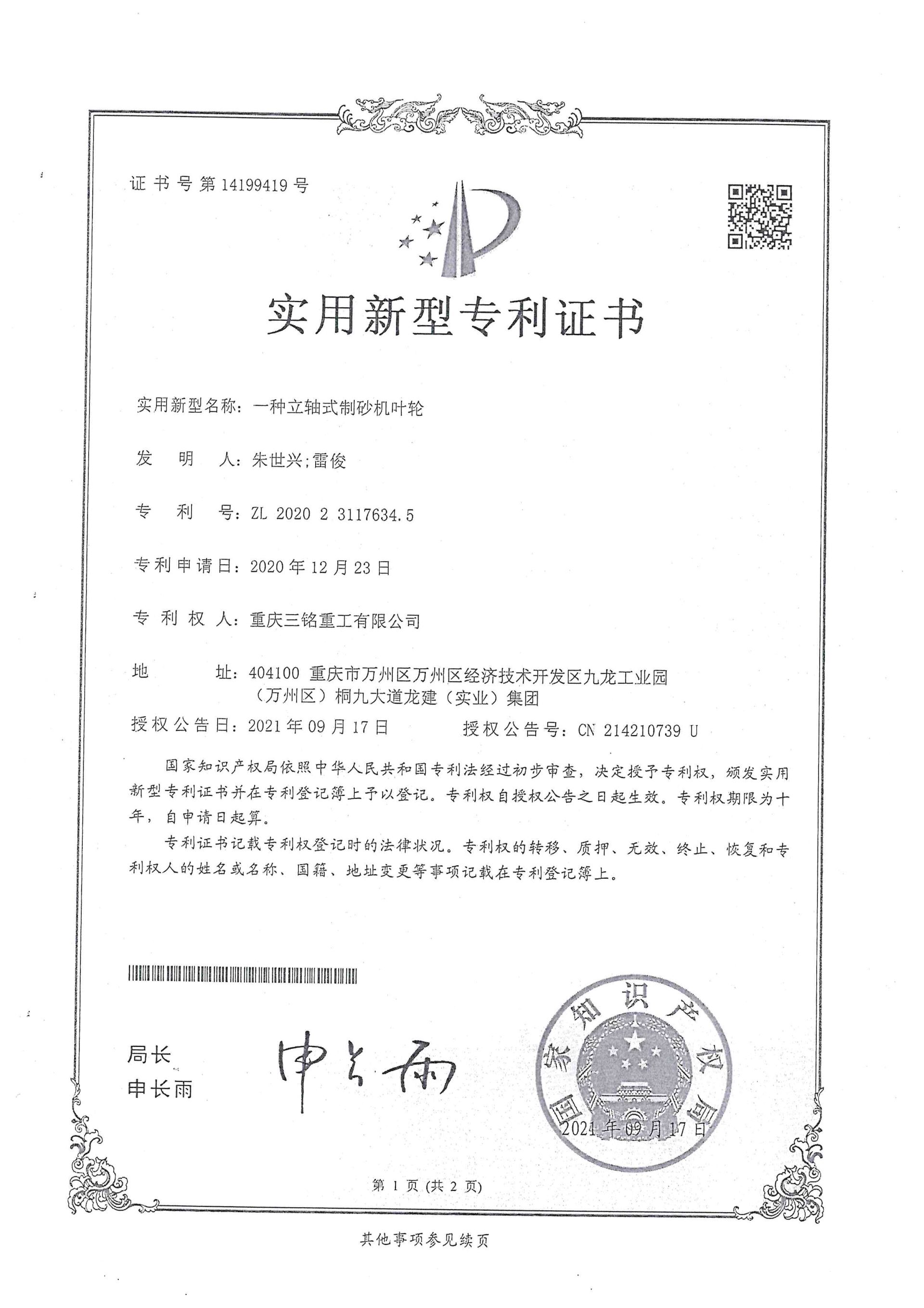 實(shí)用新型專利證書(立軸式制砂機(jī)葉輪)