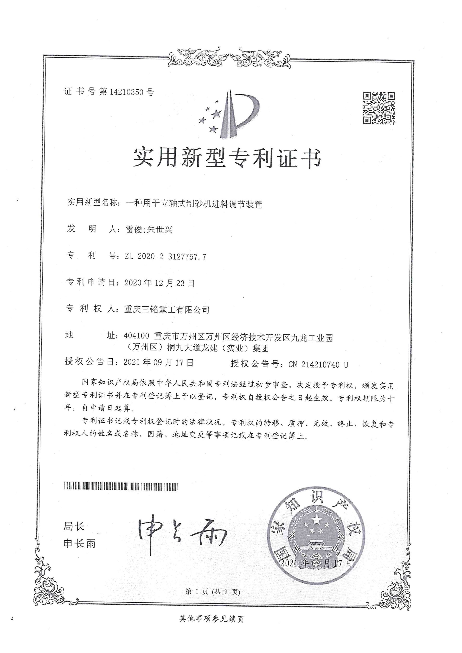 實(shí)用新型專利證書(立軸式制砂機(jī)進(jìn)料調(diào)節(jié)裝置)