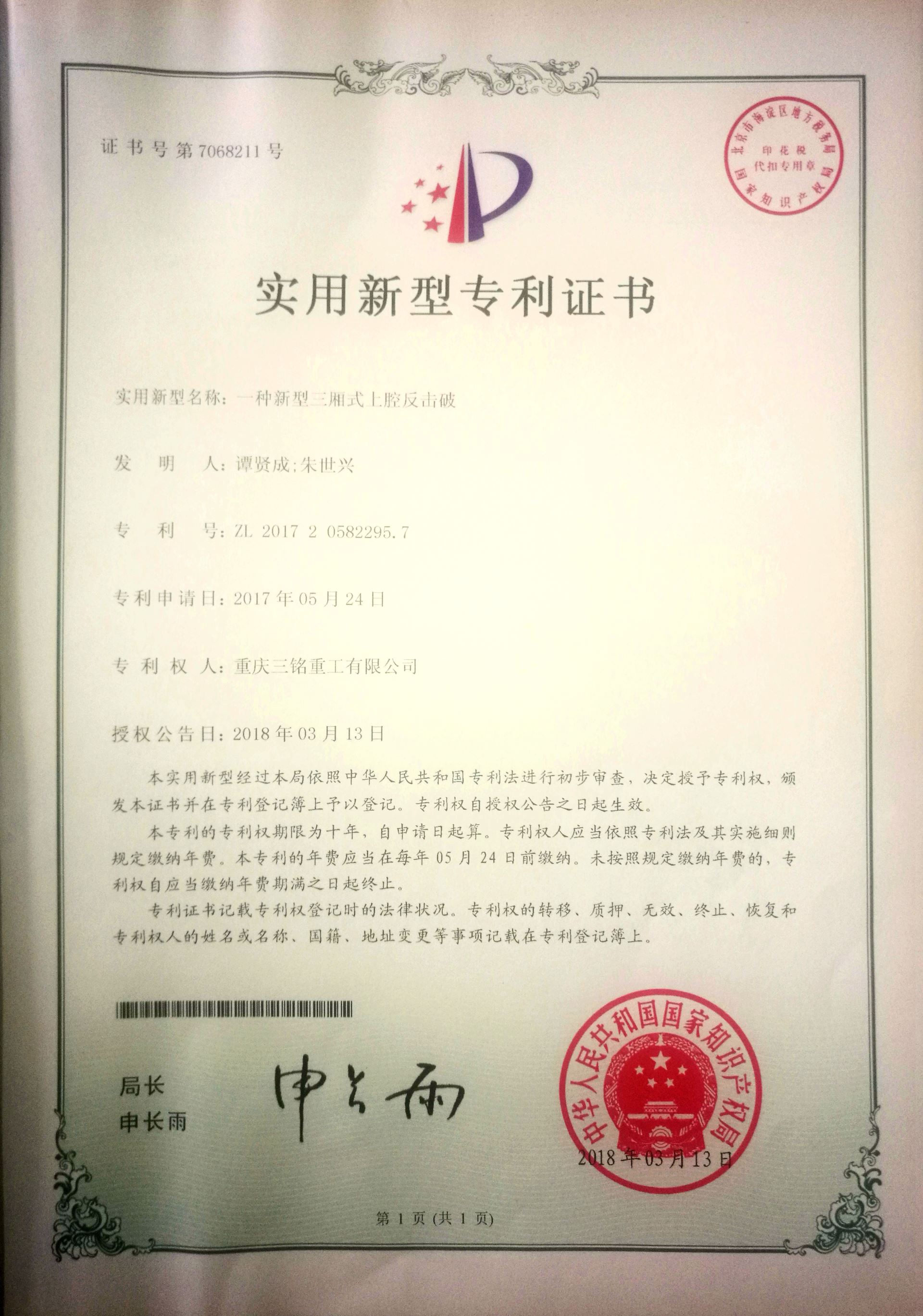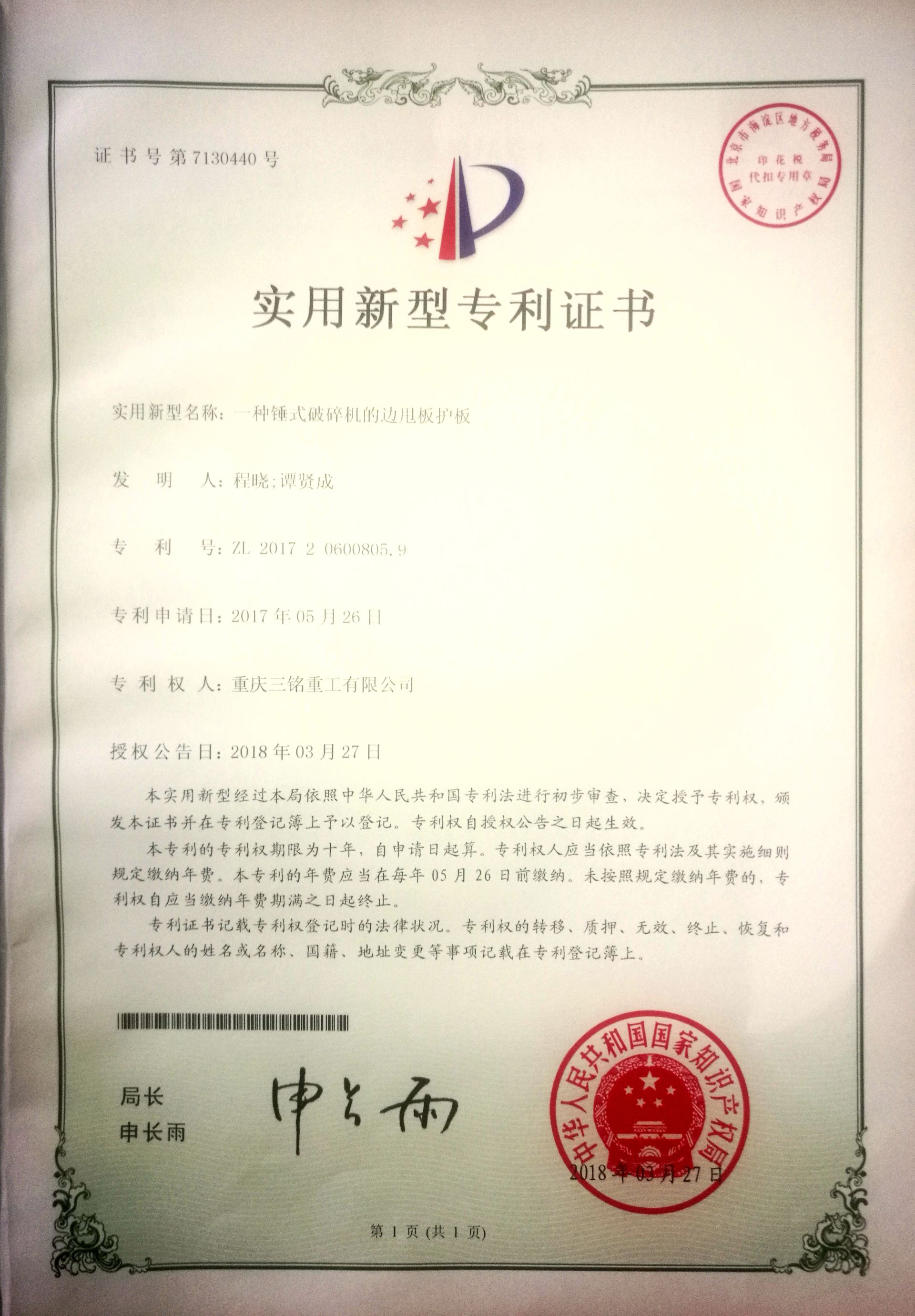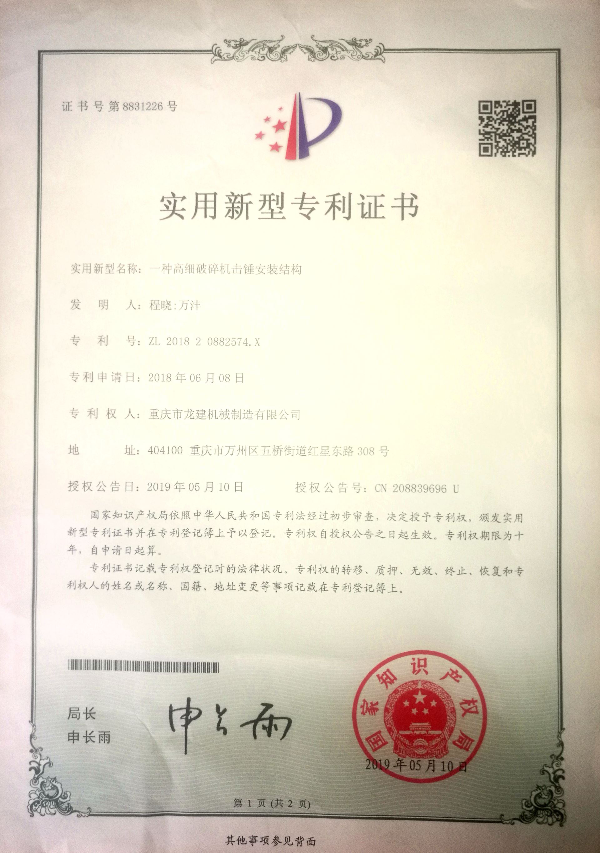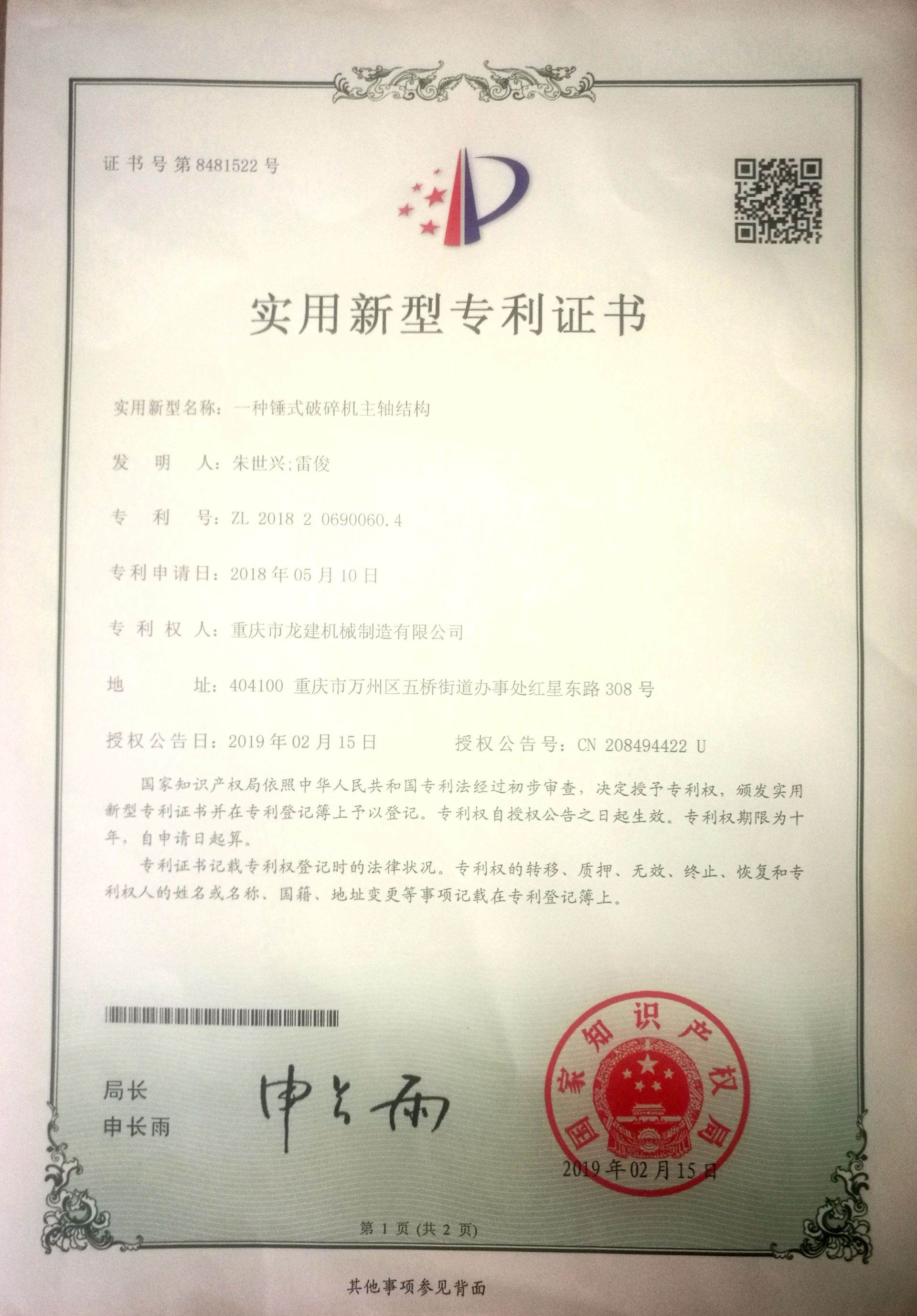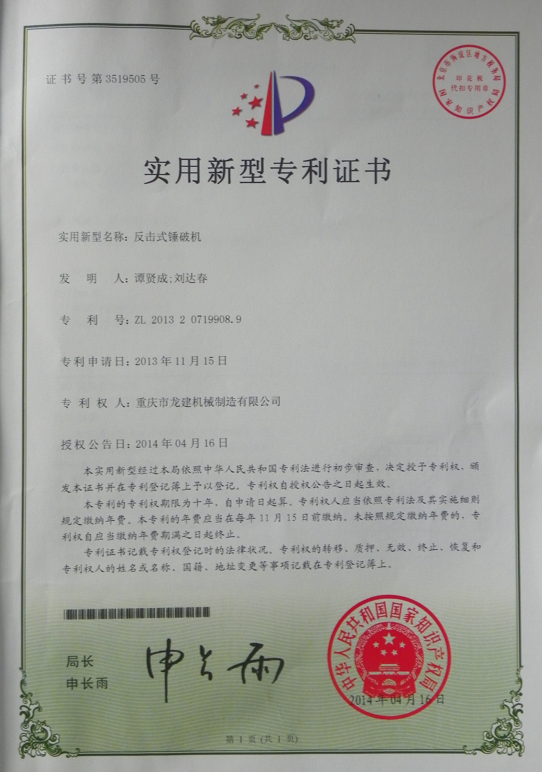 實(shí)用新型專利證書(反擊式錘破機(jī))